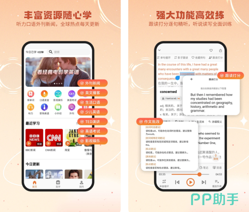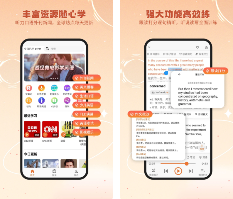有丰富的口语外语听力外刊资源每日更新,用户可以打开外刊进行跟读打分逐句精听,全面训练听说读写。有详细难点考点解析真题,帮你轻松应对不同类型的英语考试。