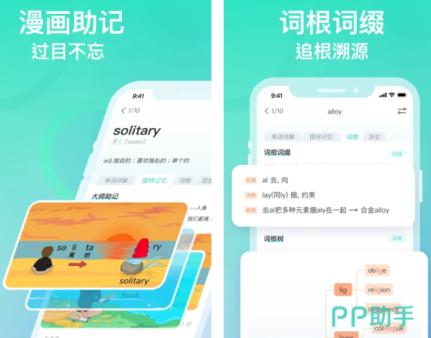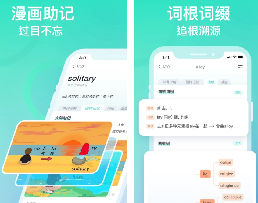 有漫画帮助记忆单词的功能,点击单词的词根词缀,可以追根溯源,扩展你的知识体系。每个当时都可以点击上方的听力阅读,对照着音标学习正确的读音,还可以及时纠正错误。