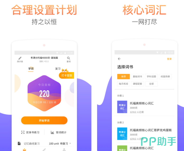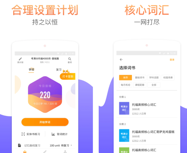 这个单词书软件集托福基础词语、英音、美英双语音频包,每个单词都有详细的字典解析以及听音辨意,考法检测成效科学都有记录。这款软件的词量大而且词库全分类细,比较推荐考生下载使用。