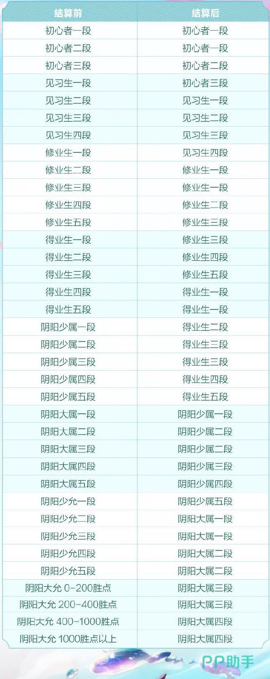 当然,也会有一些段位并不会进行更改。如初心者一道三段,见习生一到四段,修业生一段,都不会有变化。有的段位除了降段,还会将段位进行更改。如阴阳大属一到五段,会更改为阴阳少属对应的一到五段。而阴阳少允一到三段,会全部更改为阴阳大属一段。而阴阳少允四段和五段,则会更改为阴阳大属二段。