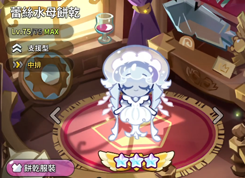 蕾丝水母饼干:这是个外形非常特殊的中排支援型饼干,它的体力与防御都十分不错,技能更是能够为队伍做出巨大贡献,其技能名为“水母束缚”,使用后会对敌人造成泡沫伤害,并附加减速,电流过载以及受到水属性伤害增益的三重debuff。