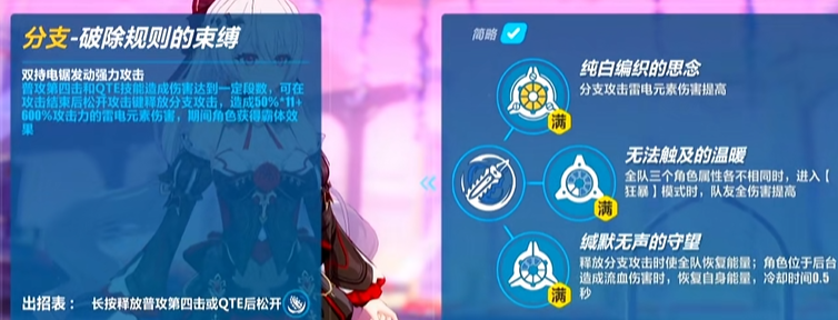 破除规则的束缚:自身的普攻会得到一定的强化效果,当德丽莎在使用普攻攻击敌人第四下的时候,ote类的技能会造成一定段数的伤害,而且在攻击结束的时候,还可以释放分支技能,对其造成再一次的雷电攻击,在释放期间,自身则是会变成霸体效果!