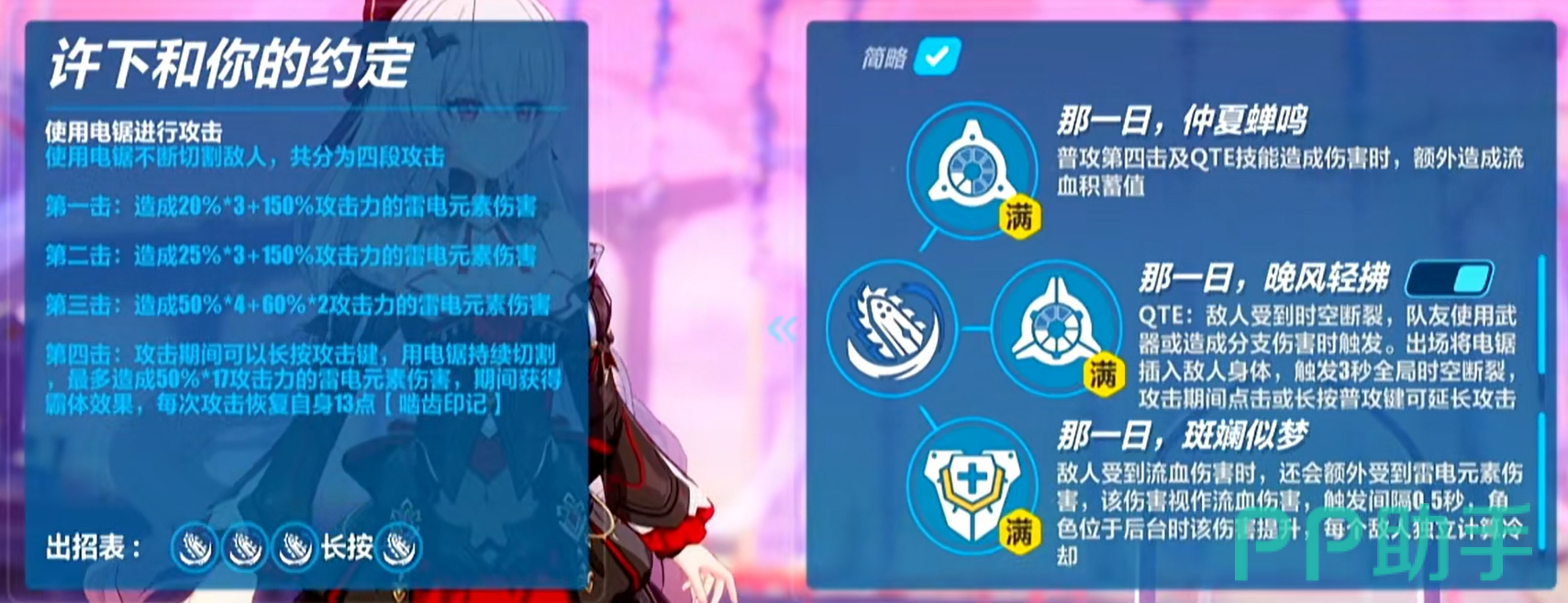 许下和你的约定:这个技能就是德丽莎的普攻技能了,不过这个普攻技能的方式则会变换成电锯攻击,也是非常的狂暴了,这个技能主要分成了四个部分,四个部分都是造成雷电元素的伤害,每一层的伤害会逐渐的叠加,到第四下的时候,攻击方式则会变成可以蓄力的方式,对敌人造成更高的伤害!