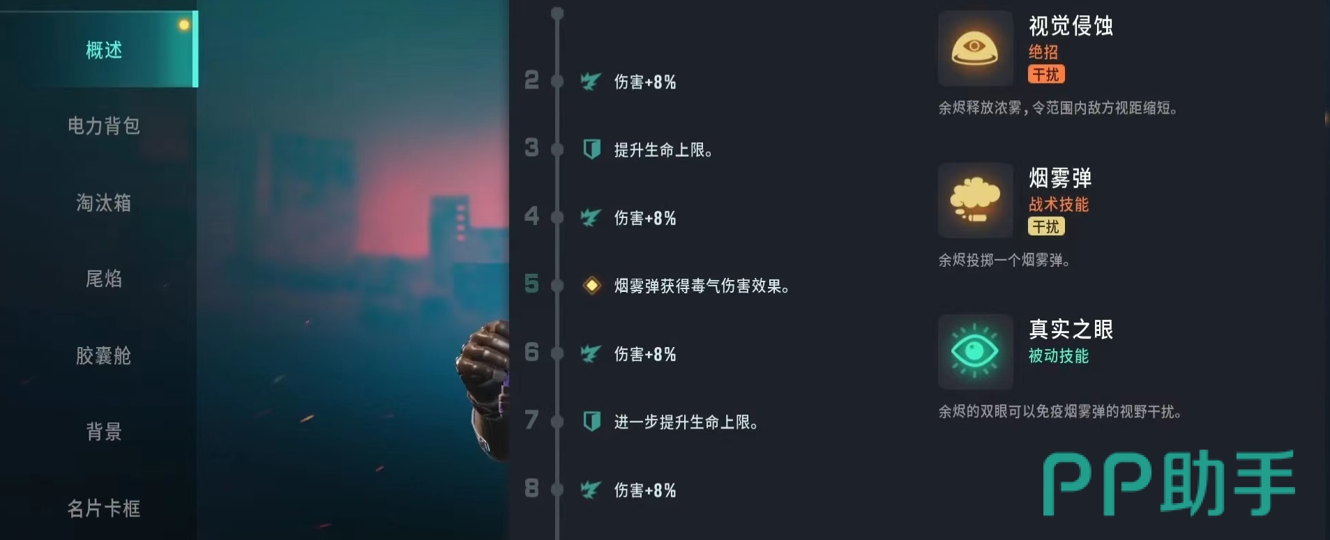 接下来推荐的是余烬,对于很多新手来说这是很值得一试的人物。绝招视觉侵袭,释放出浓浓烟雾,令范围内敌方视距缩短。相比于其他防御或是输出,这一项绝招效果偏向于干扰,更符合战术要求,如果使用得当对方将会大大降低视觉范围,很难发现并且进行精确射击,进攻或是撤退都有效果。战术技能烟雾弹,投出烟雾弹来对目标进行干被,被动技能真实之眼,余烬双眼可以免疫烟雾弹视野干扰,这样就造成视野方面优势。