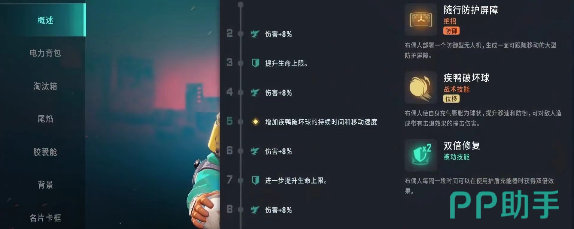 最后推荐的是布偶人,也属于防御类型,绝招随行防护屏障,部署防御型无人机生成大型防护屏障,该屏障特点是能够跟随移动,这样就可以伴随一起进攻或者是撤退,对团队有着很好的辅助能力。战术技能使自身快速充气膨胀为球状,移动速度和防御大幅提升,对敌方造成带有击退的碰撞伤害。