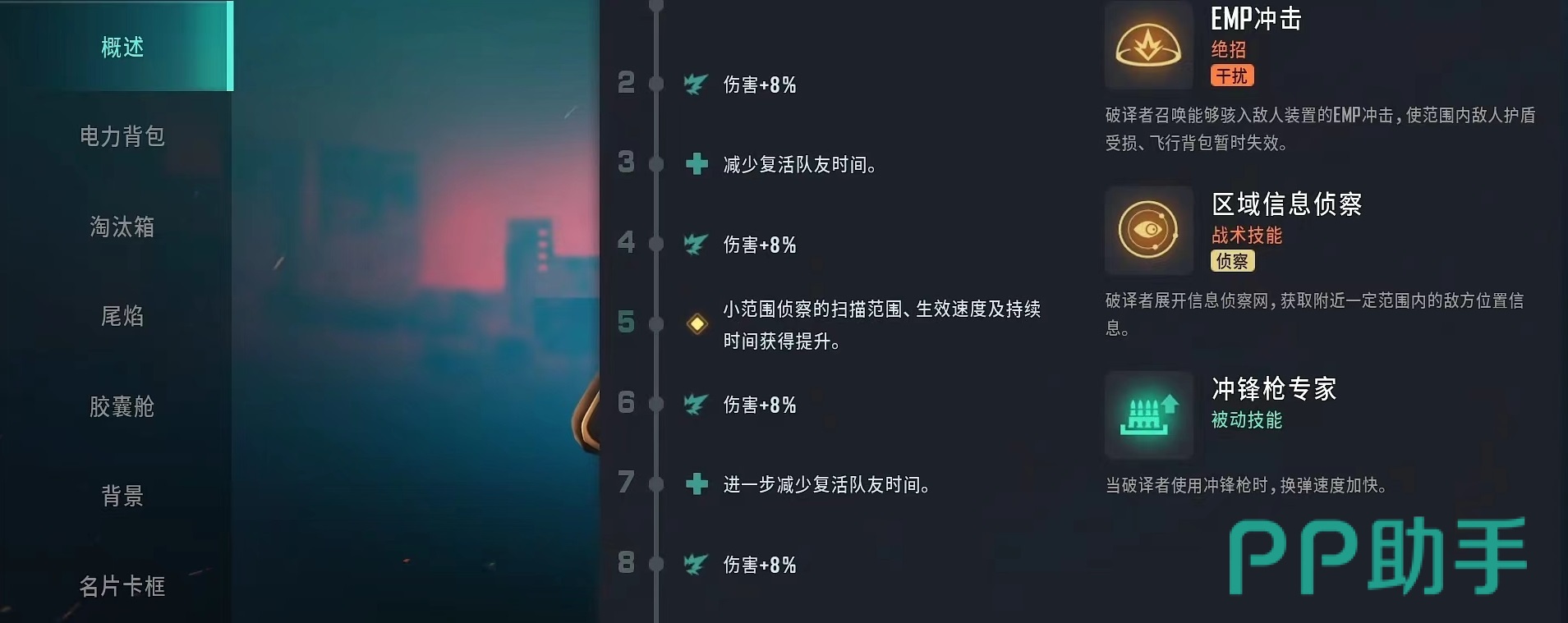 第3个推荐的是破译者,这属于熟悉游戏性能以后再推荐上手的人物。绝招EMP冲击,能够入侵敌方装置,使范围内敌人护盾受到损害,飞行背包暂时失效。飞行背包是游戏中很有创意的设定,让角色灵活性大大增加,很多人在习惯使用飞行背包以后一旦暂时失效,就会受到很大程度干扰。战术技能区域信息侦查,展开信息侦查网,获取附近范围内敌方位置信息,这就相当于为接下来输出指明方向,也使得躲在暗处敌人无所遁形。被动技能为冲锋枪专家,在使用冲锋枪时换弹速度加快,所以绝大多数该角色都会装备冲锋枪。