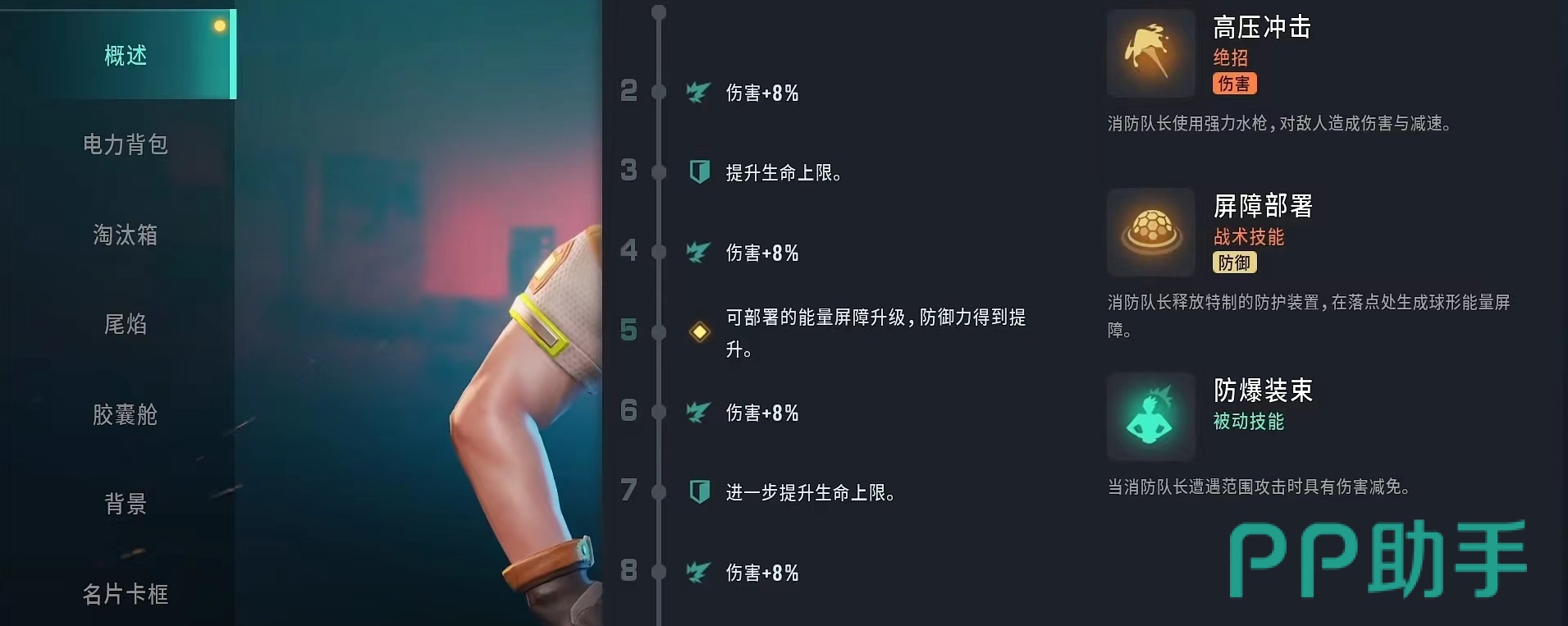 首先推荐的是消防队长,这名角色通过提升等级可以有效提高伤害,生命上限等属性,在攻防方面都有着出色表现。使用自己绝招高压冲击,掏出强力水枪来对敌方造成伤害和减速,减速是游戏中很有效的控制效果,能防止对方快速被移出我们的攻击范围,实现有效击杀。战术技能属于防御类型的屏障部署,释放出特制防护装置生成球形能量屏障,屏障可以有伤伤阻挡伤害,保护后面队友输出或是撤退。被动技能防爆装束,当消防队长受到范围攻击时具有伤害减免效果,只有范围攻击才会生效,但依然是很好用的防御类型。