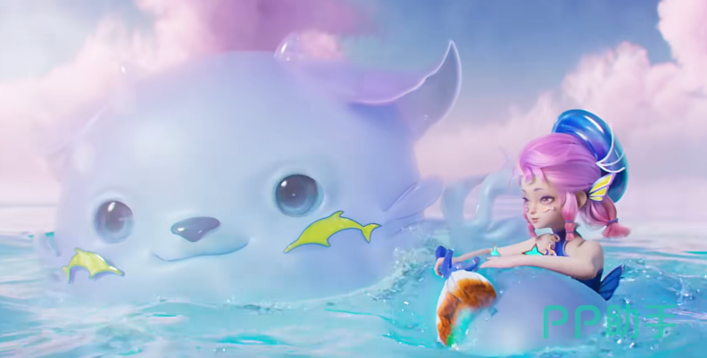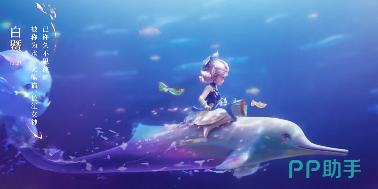 它的坐骑在该皮肤下变成了一只通体洁白的萌物,不过体型依然很大,从宣传CG不难预料到它在放技能时应该会有不少水花特效,这倒是与原皮的绿色风格形成了鲜明对比,另外该皮肤的宣传CG中还反复提及了一种叫白鱀豚的生物,所以它的部分技能可能也会召唤出这一生物作为点缀。