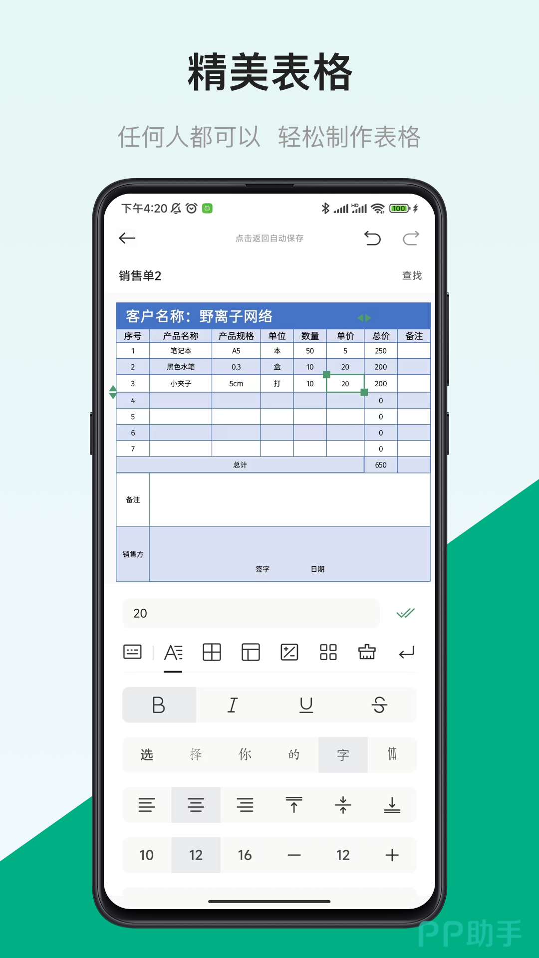 这是一个有着强大编辑能力的制作软件,不管小伙伴们想要去制作一些文档,还是制作一些表格,都是可以轻松搞定的,平时可以帮助小伙伴们去制作考勤表,此外其他的表格也都可以,甚至还有一些简单的文档,都是小伙伴们随时都可以在手机上去完成的。