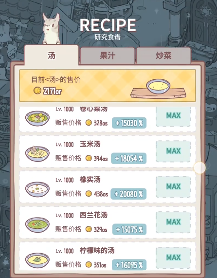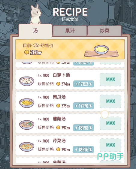 以上这些便是关于猫咪和汤魔法食谱的介绍和具体的开发说明。玩家们初期所搜集到的蔬菜基本上都可以开发成汤,果汁和炒菜。玩家们如果想初期赚的更多的话,可以考虑不停的提高料理的等级来增加收入。