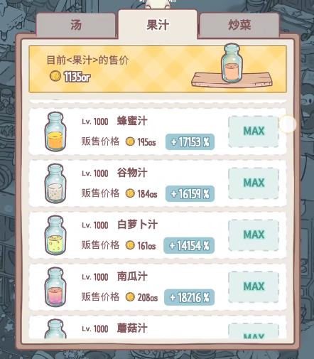 第二个要说的便是果汁,这种菜谱也是中后期卖的比较多的一种。果汁的制作的开发比起汤来要简单一些,玩家们在一开始便可以获得玉米汁,无味果汁,胡萝卜汁等等。后期随着材料的增加也能开发出新的菜谱。