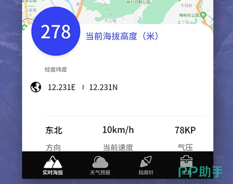 软件能为大家带来实时的海拔测量信息,同时像高度、气压以及速度等等,这些信息用户都是能掌握的,更是为大家带来了指南针和准确的天气预报信息,像地理位置以及纬度、经度等等,此类信息都能快速的掌握在手中。