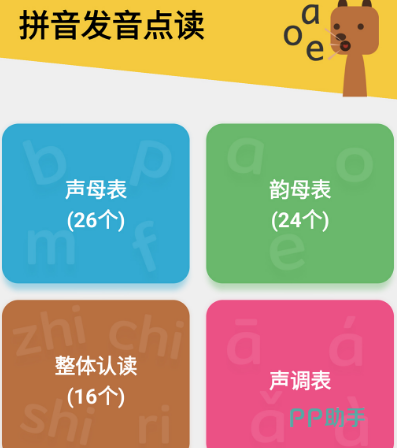 无论哪个年龄段想要学习拼音,就应该从基础知识学起,虽然看似这是专门为儿童所设计的软件,但对于零基础的成年人来说也非常适合。其中包含全面的拼音知识,比如韵母、声母、整体认读音节等等。