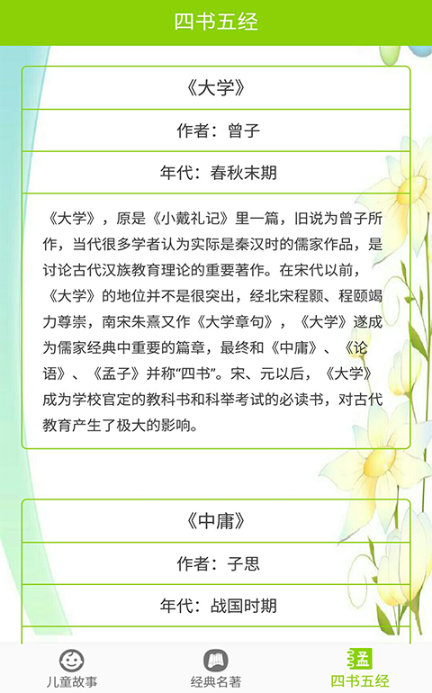 有了这个软件之后宝妈们就不会担心孩子输到起跑线上了,能够够为大家分享更多的幼教资源,儿童故事、儿童歌曲、儿童口才、音乐、手工等等的内容都有,像著名的四书五经也有。