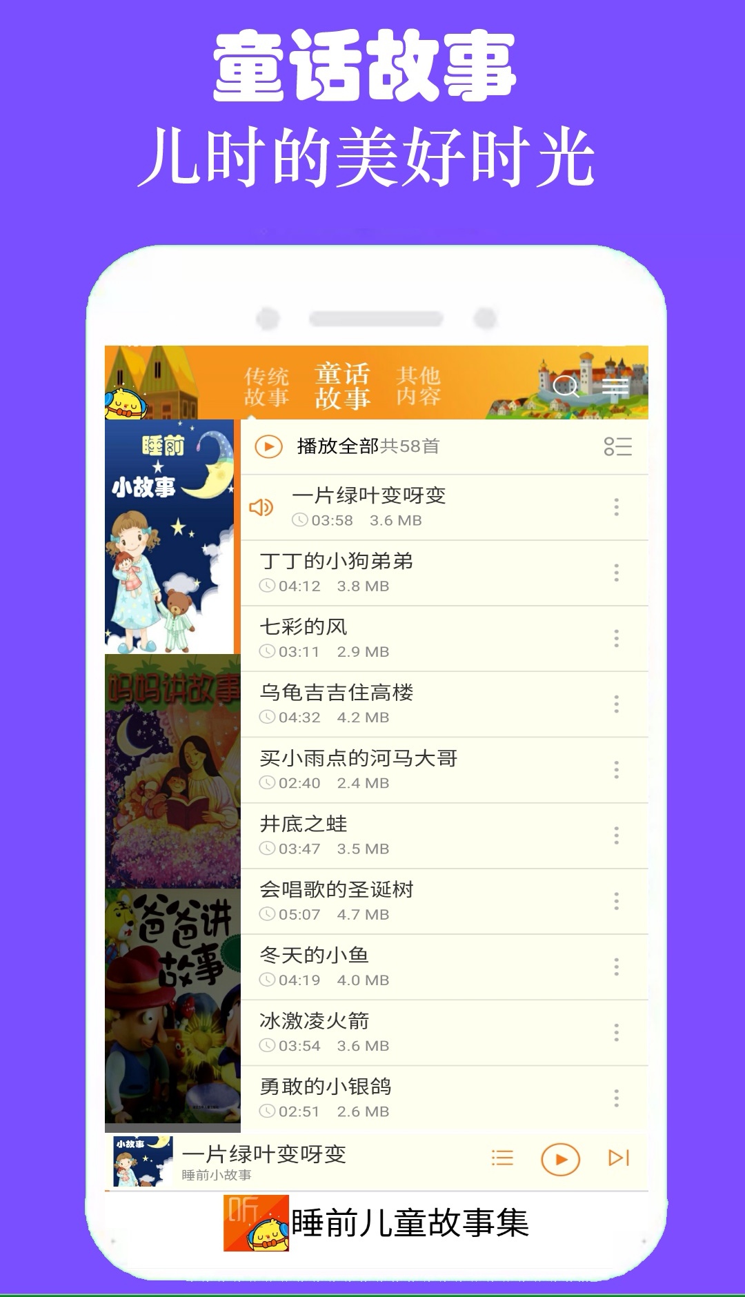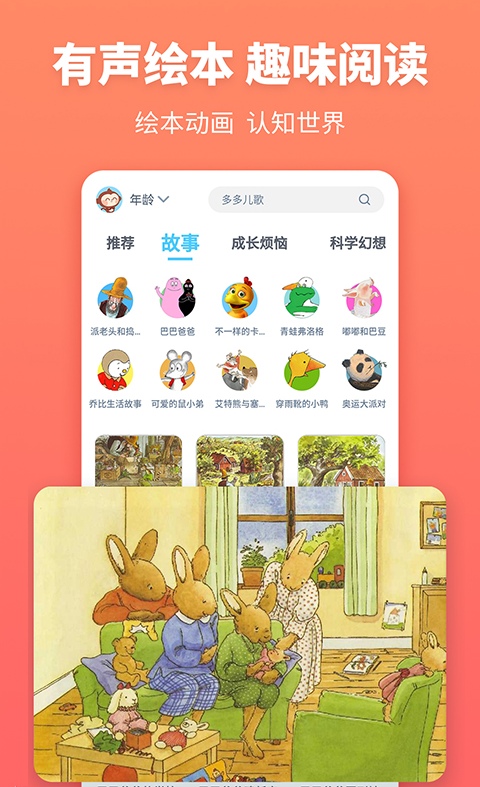儿童故事绘本阅读的必备APP,有很多的儿歌故事、英文儿歌动画、听儿歌,听故事,就能很好的开发宝宝们的思维能力,安徒生童话和成语童话等等都有,超多精彩的绘本故事。