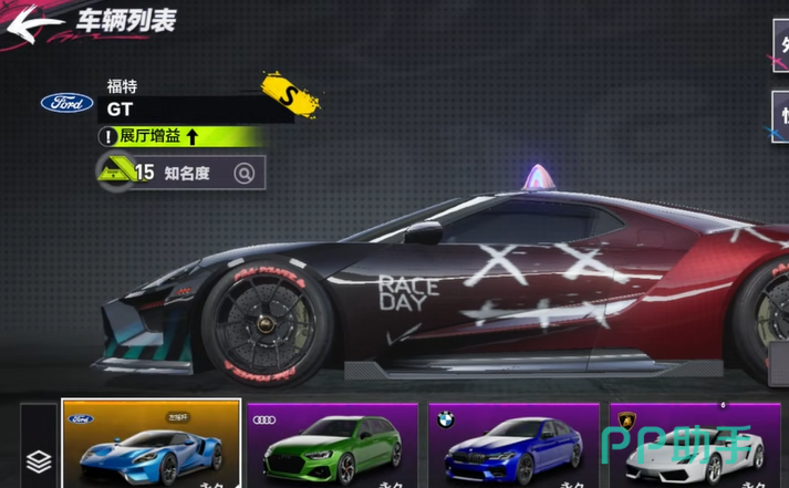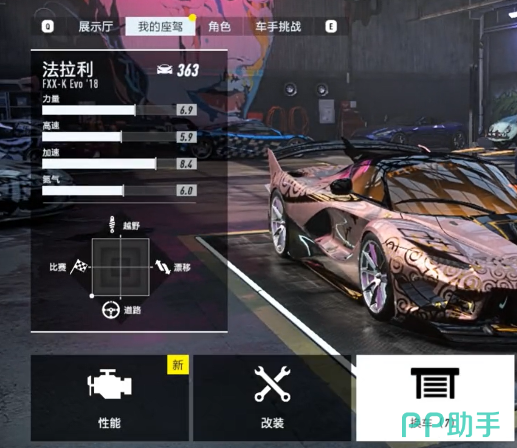 首先就是游戏初期的赛车选择了,【法拉利fxx-k Evo】,这款车初始性能就非常的不错,而且从四项数值来看,在加速方面是比其他车更为快速的,这就意味着前期在一些氮气加速过程中,是很容易就超越对手的,
