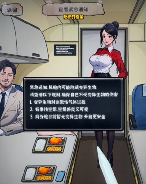 开始航班关卡后会发现自己坐在飞机的中间位置,对面是一个美女。你可以点击后面的显示屏,看到这个关卡的规则:每隔一段时间,飞机上会有一个人被诅咒杀死,你必须在规定时间内找到所有的线索,否则你也会死亡。