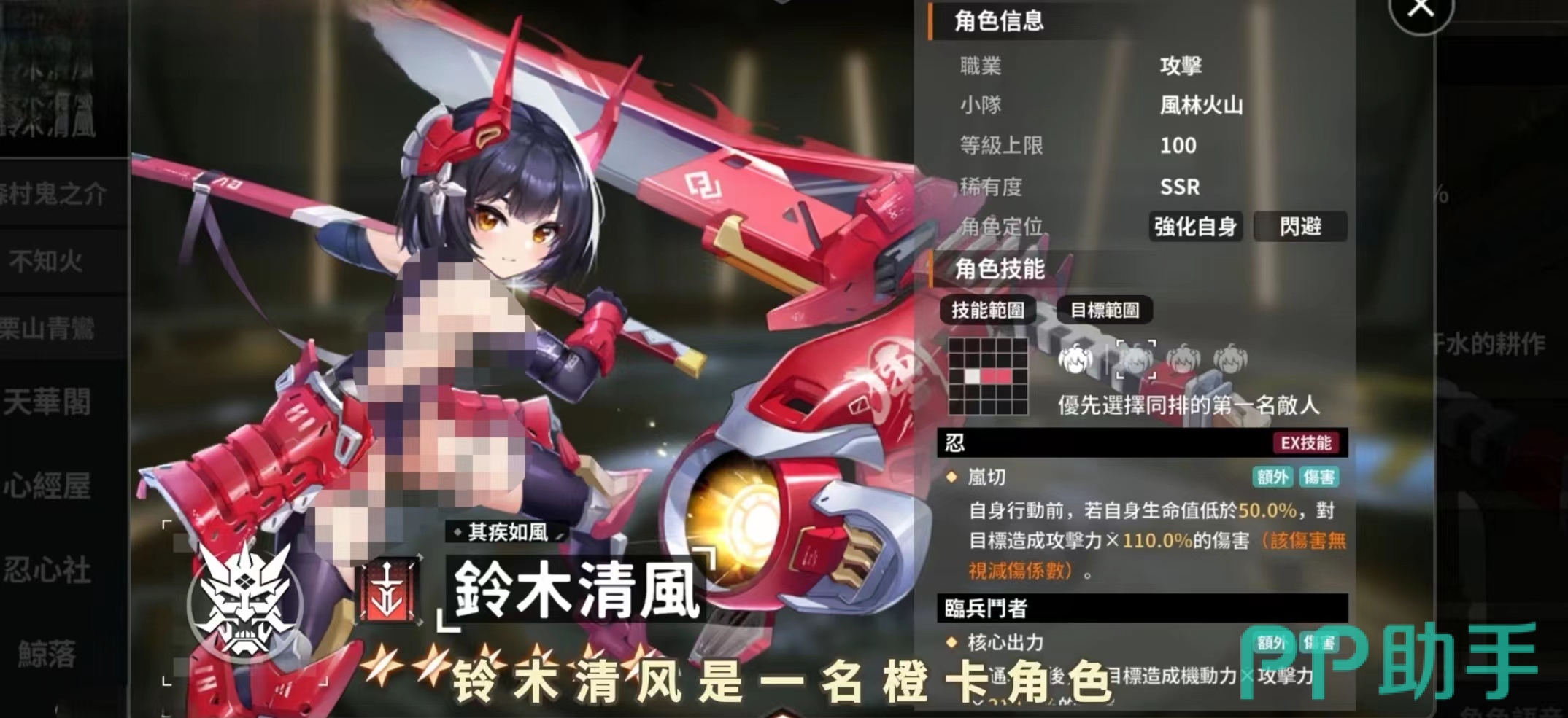 铃木清风,这个角色是一个自带躲闪技能的灵活性角色,她的生存能力相比于其她角色来说是要比较突出的存在,同时输出攻击能力也是不俗。