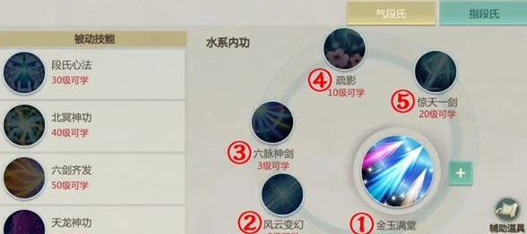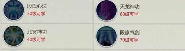 再来看看他的被动技能,第一个叫段氏心法,可以提高角色的攻击力,第二个叫北冥神功,可以缓解自己和附近队友的负面状态。其次六剑齐发,可以提高角色的暴击效果,然后是天龙神功,可以提高攻击效果。