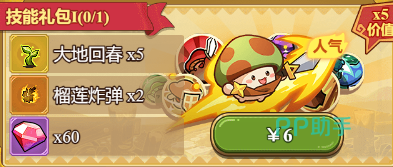 兑换完礼包之后,小伙伴们可以微氪的情况下还可以去商店购买游戏的6元礼包,由于是首充,所以会送小伙伴们不少东西,有大地回春和蘑菇罩,都是后面游戏小伙伴们可以用上的。