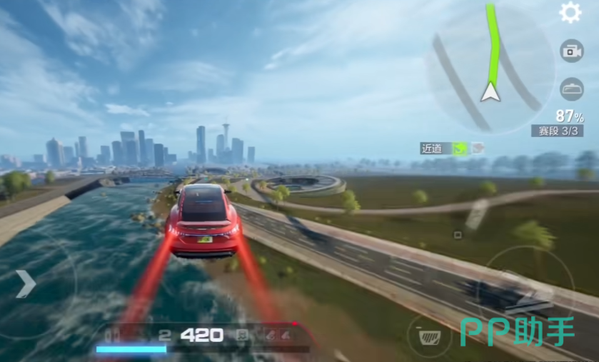 其次必须掌握漂移状态下的两种技巧。惯性漂移用于小角度过弯,按住方向键先点刹车后踩油门,达到跨度过弯目的。反向漂移用于大角度过弯,按住与漂移方相反的方向键,先点刹车后踩油门,达到调正车头的目的。另外,还有落地提速也必须掌握,当车辆腾空起落地时地面会出现打滑的情况,需要玩家在落地时油门松开,然后落地后点击油门,即可结束打滑状态并获得加速效果。