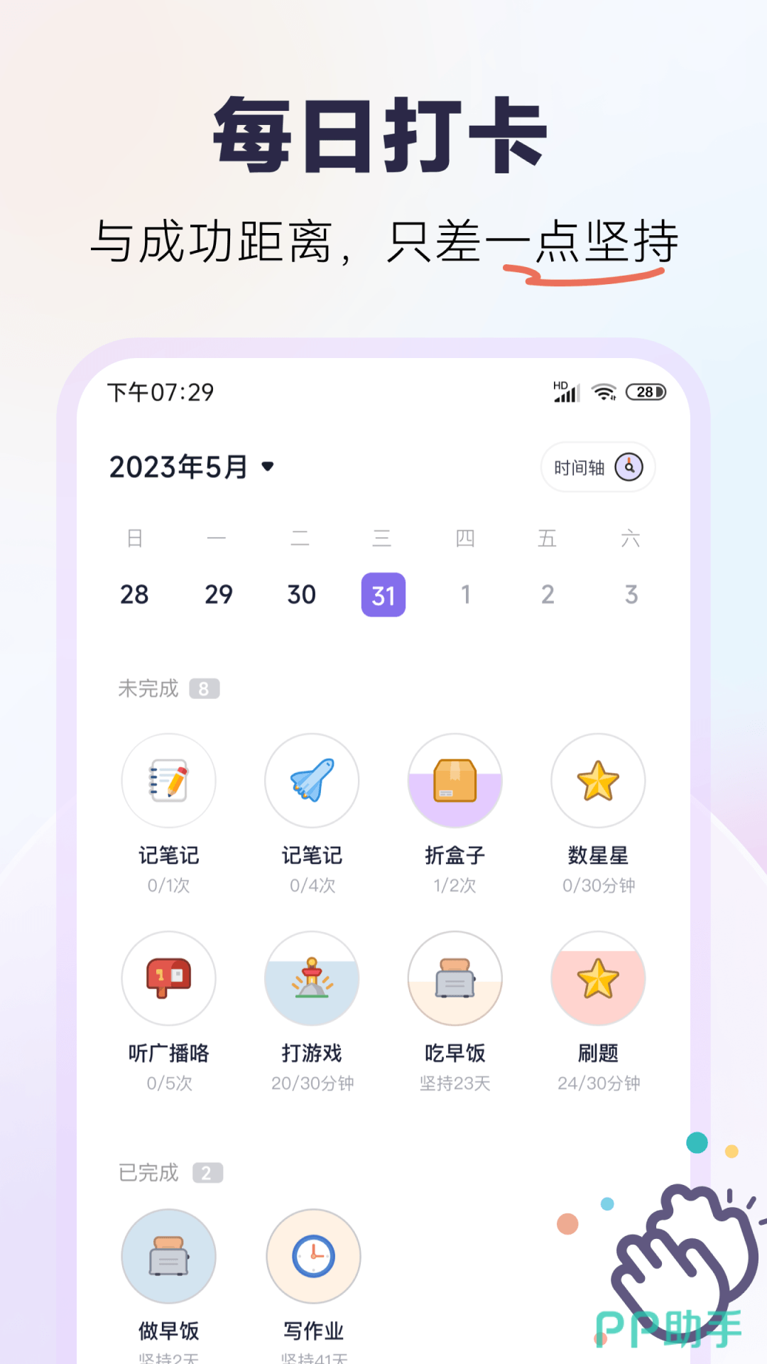 这款软件可以为用户提供个性化的打卡服务,满足用户不同的使用需求,让需要进行打卡的用户在文字的世界里尽情遨游,养成好的习惯。