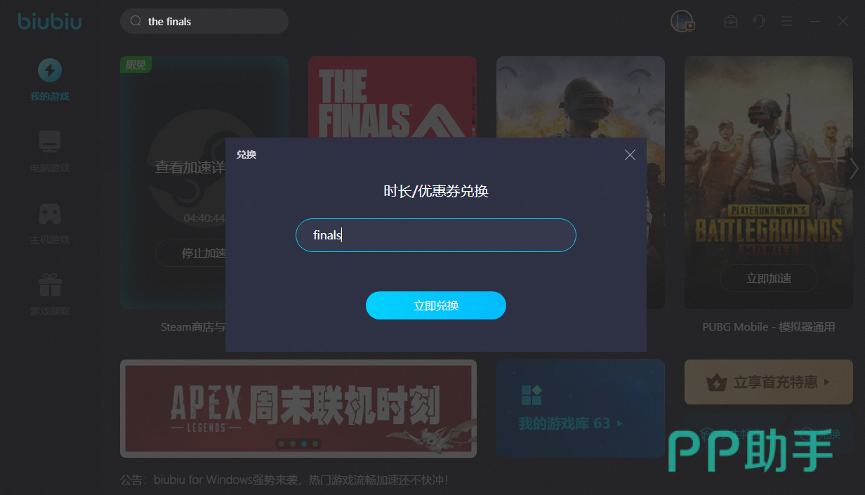 现在去使用的朋友能享受到平台为大家开放的各类福利,就比如用户在软件的首页,点击兑换后输入Finals,就能领取到24小时的会员试用,这点来看还是非常不错的,同时新用户注册以后还有能24小时的免费加速机会给到大家,整体而言性价比极高。