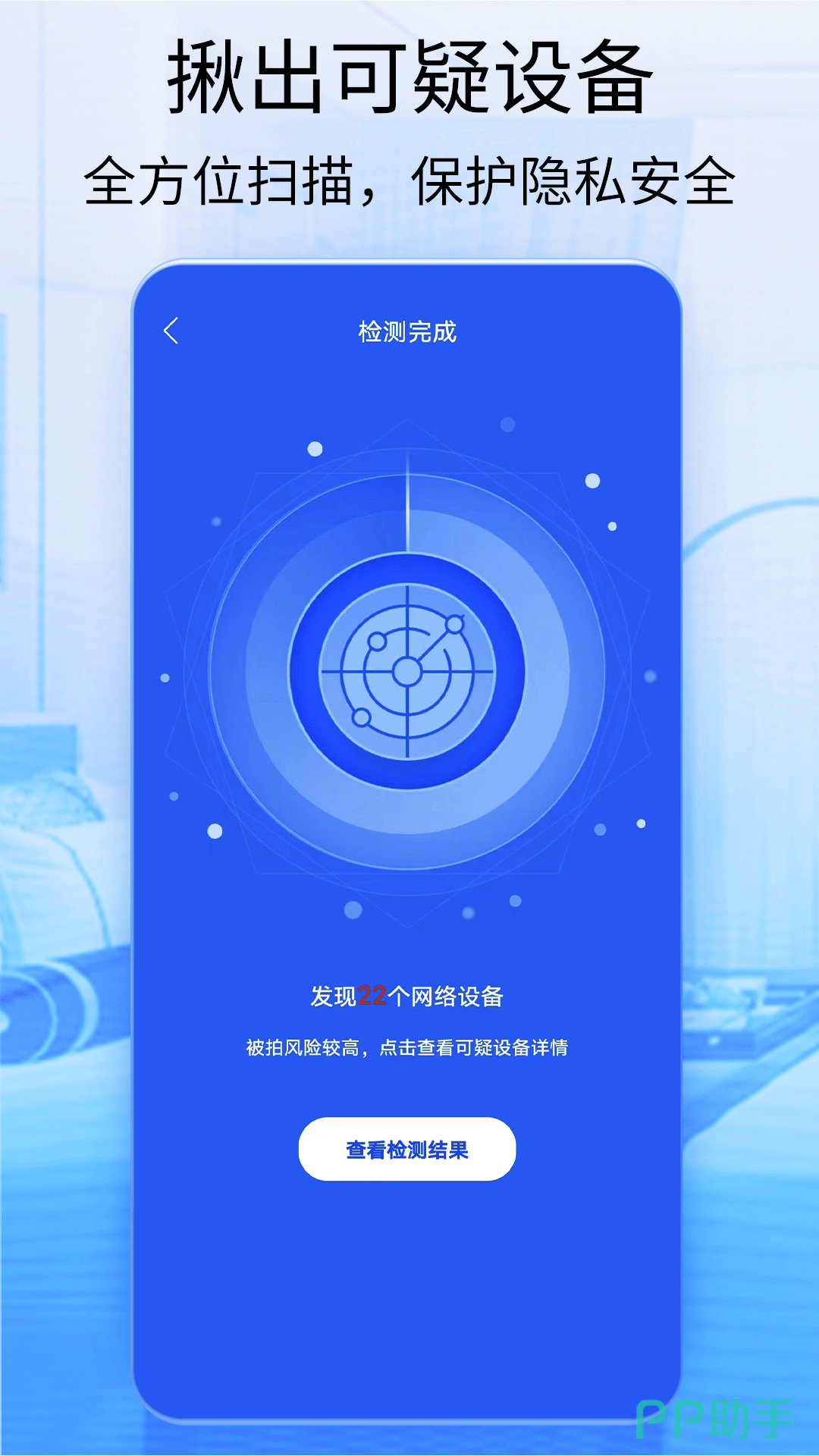 有了这款,可以进行摄像头查找的工具,无论隐藏的在隐蔽的摄像头都能够被这款APP检测出来,用户只需要在自己居住的环境当中打开这个事情的查找功能,就能够查找到针孔摄像头所散发出来的一些信号,检测这些信号。