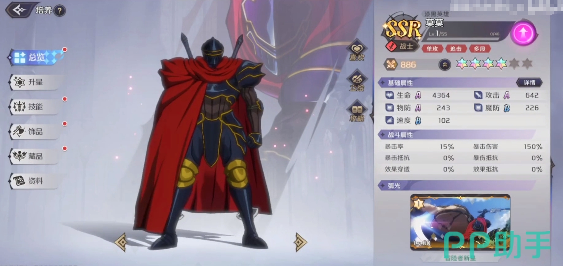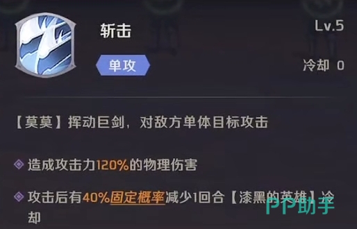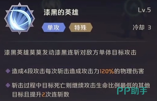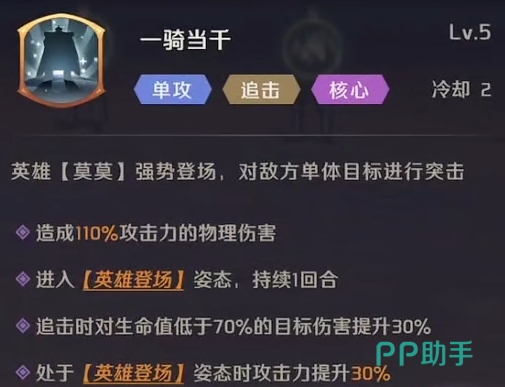 普攻则是120%攻击加成的单体物理伤害,而且有一定概率能够减少大招的冷却,主动技能“一骑当千”也同样是物伤类型的单体攻击,不过攻击加成比普攻略低一些,但该技能会使莫莫进入英雄登场姿态,这个姿态可以在队友攻击一名敌人后进行追击,并且该姿态对70%血以下敌人还有额外伤害。