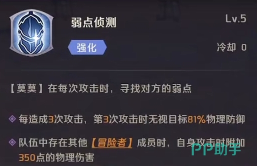 被动技能则是弱点侦测,每第三次攻击都可以无视敌人大部分的防御,如果同队有其他冒险者角色,则攻击时还会附加额外物理伤害,两者配合之下能对敌人产生极大的威胁。