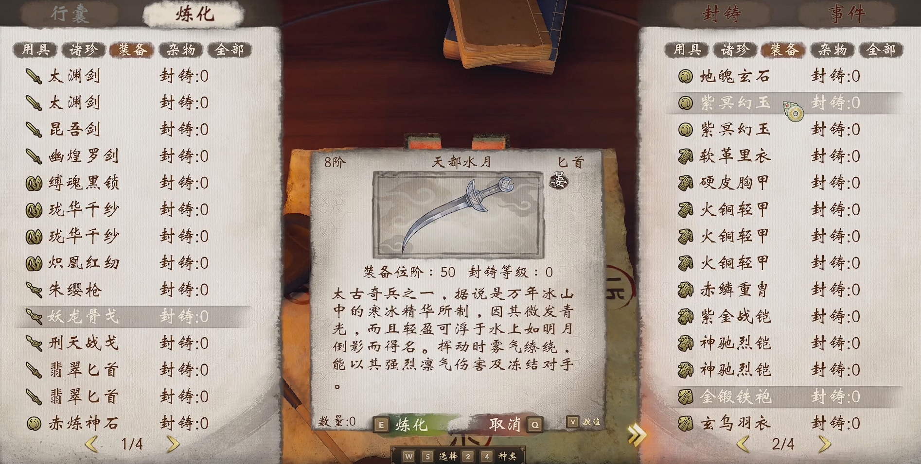 接下来给大家分享的便是太古奇兵之一,由万年冰山所著的天都水月。因为其刀刃上微发着青光,并且轻盈如同可以浮在水面上,如明月倒影一般而得名。是目前而言,八阶级别的非常强力的冰系武器装备。可以给对面造成非常严重的冰系伤害,并冻结对手。玩家们可以通过将妖龙骨戈以及紫冥幻玉进行该武器的炼化。