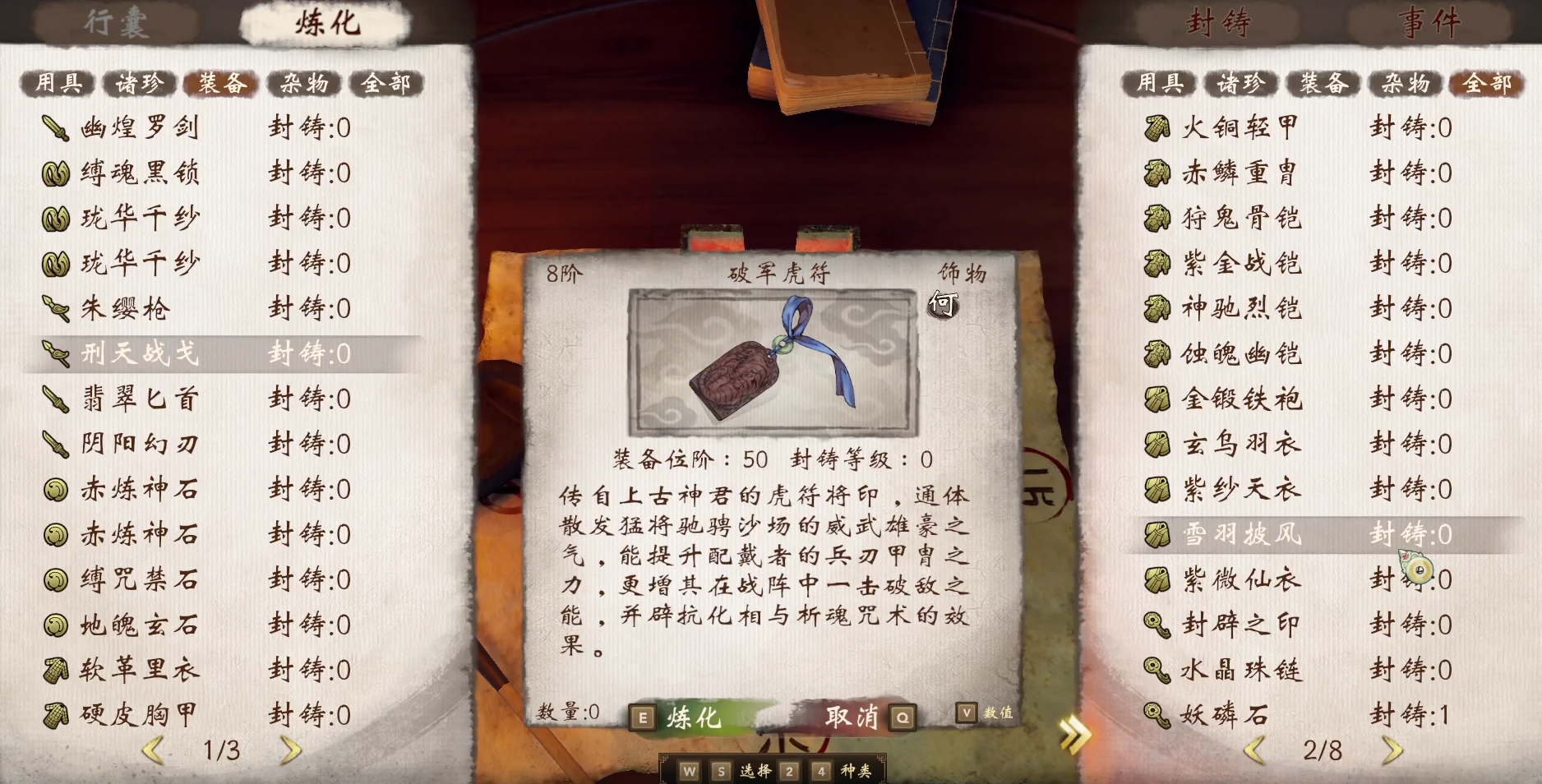 传说是来自于上古神君的虎符将军印,通体散发着猛将驰骋沙场的豪壮之气。能大幅度提升佩戴者的兵刃甲胄属性,更能增强其在战斗过程当中的一击破敌之力,并强化相与析魂咒术的效果。玩家可以通过刑天战戈,加上我们的雪羽披风进行炼化制作所得。