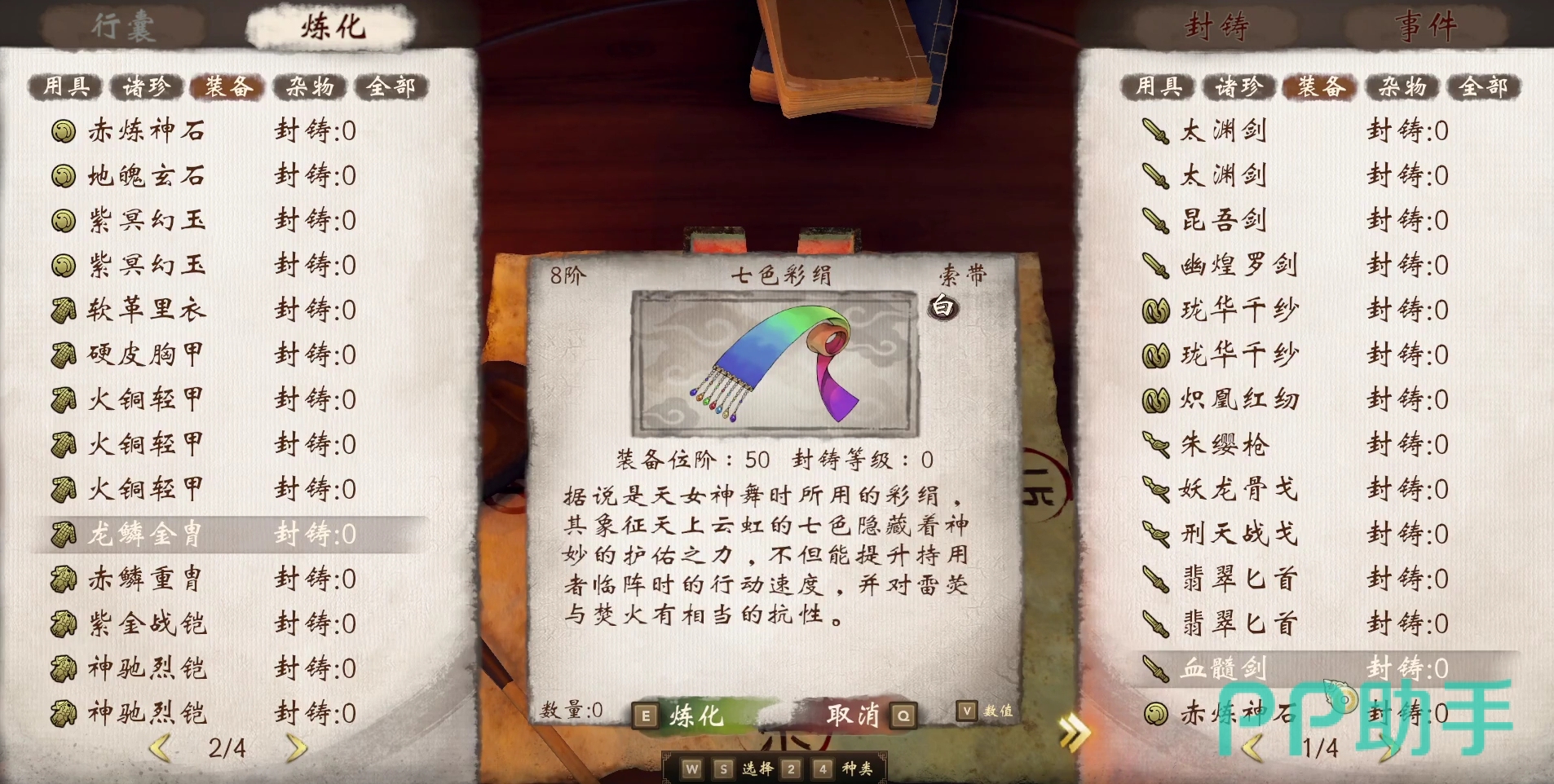 那么第一个可以炼化的装备便是九天神女挥舞所用的彩娟,其象征着天上的云虹,其七彩的颜色隐含着神庙的护佑之力。佩戴之后,不仅可以提升所使用者在战斗时候的行动速度,并且在面对雷公以及火攻的时候,有着相当不错的抗性。具体炼化方面,可以通过装备当中的龙鳞金咒以及装备当中的血髓剑进行炼化。