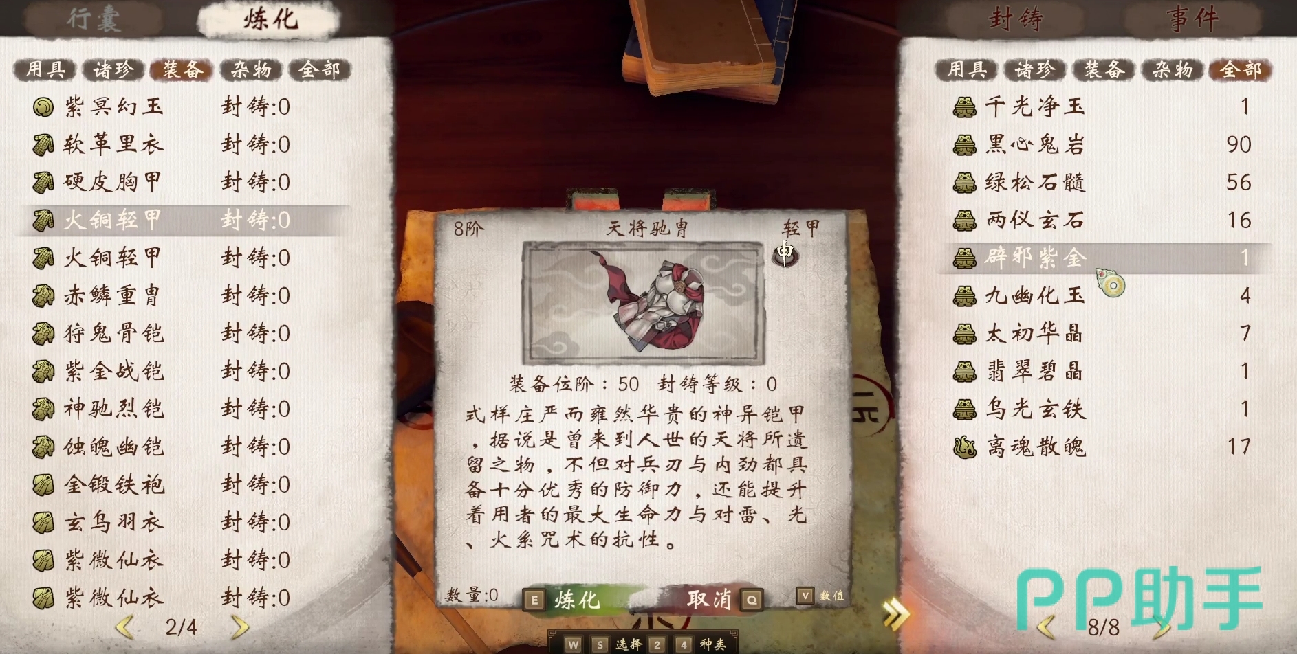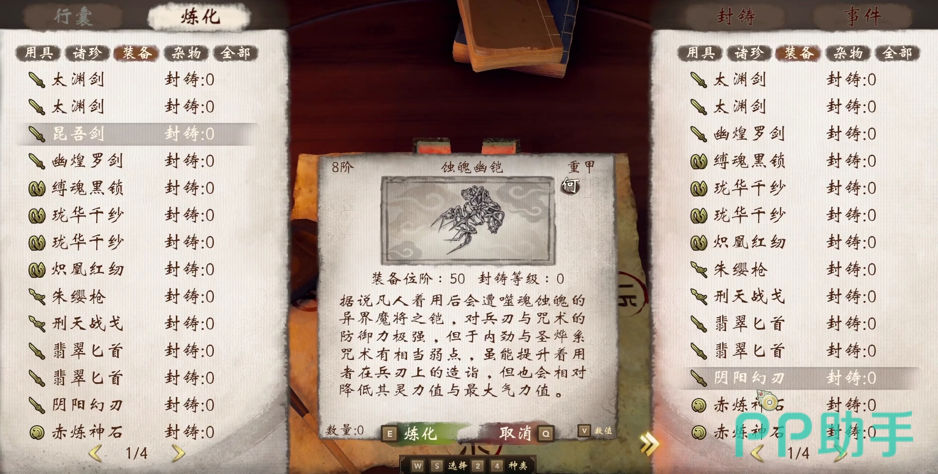 这是一件非常好用的防具,八阶的重甲蚀魄幽铠。据说凡人使用之后会遭魂魄所侵蚀的魔将之凯,拥有对于兵刃以及咒术的超强防御力。但是对于一些内劲及圣烨系的咒术,略微有些不足。能够加强装备者在兵刃方面的强度,但也会相对而言,降低角色的灵气值和最大气力值。玩家们可以通过昆吾剑加上阴阳幻刃进行该武器的炼化。