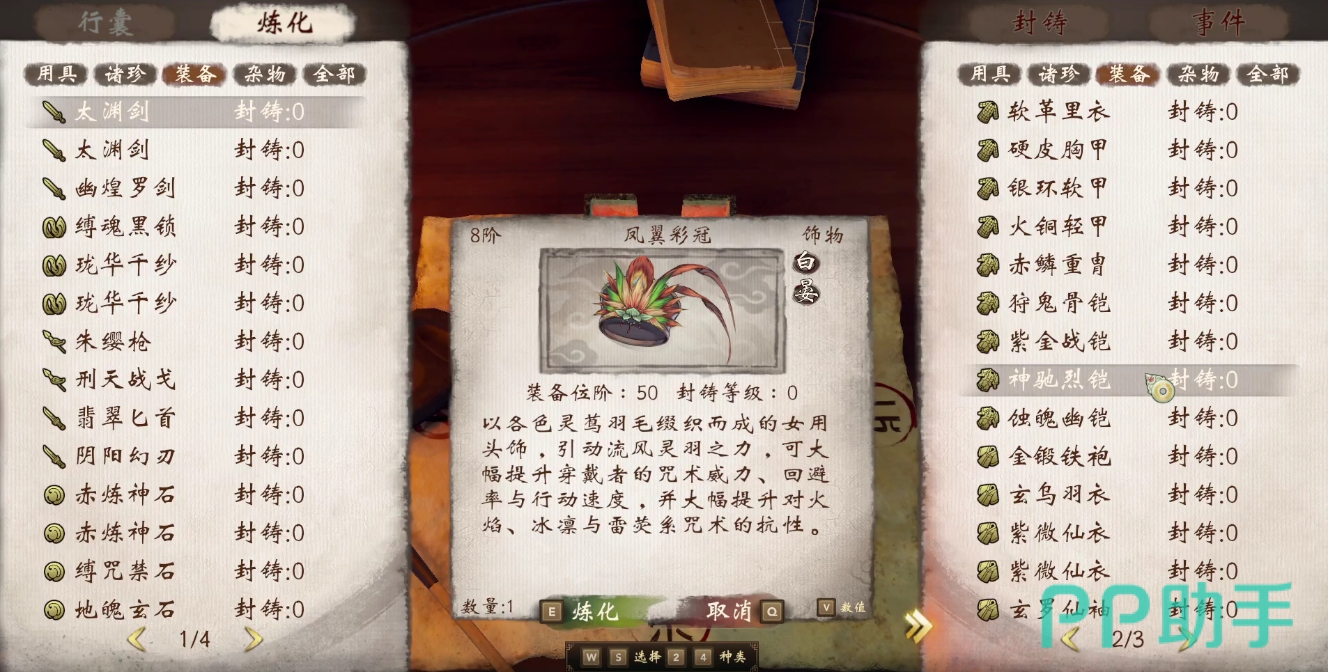 第六件给大家推荐的便是我们的凤翼彩冠,也是一个极品的八阶饰品装备。以各色羽毛所编织而成的女用头饰,游戏内可以女角色佩戴并使用。可大幅度提升穿戴者的咒术威力,回避率以及行动速度。大幅度提升角色对于火系,冰系以及雷系的咒术抗性。虽然不能直接提供血量方面以及内劲方面的加成,但额外的多属性抗性和其他方面加成已经是非常不错的了。玩家们可以通过太渊剑以及神驰烈铠进行炼化制作。