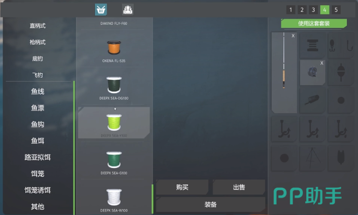 选择好之后,大家需要对这个进行一个重新的装备,首先点击鱼竿选择【飞钓竿】;卷线轮的话也是选择飞钓的卷线轮,鱼线的话这里需要注意要使用【前端沉水线】或者【全浮线】,在商城中可以直接购买;由于这个钓法对装备的要求比较高,大家需要注意的是,在进行一些基础的鱼竿进行设置的时候,一定需要一步步来进行安装!