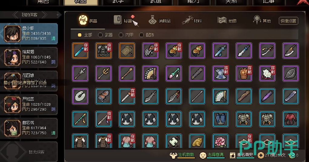 游戏中有很多装备和道具可以帮助你提高你的战斗力,如武器、护甲、饰品、药物等。武器方面,剑修当然是选择剑类武器,并且注意其属性和特效。大石剑可以增加你的臂力和攻击力,夜明珠可以增加你的敏捷和御剑值等。而护甲方面轻便而防御较高的护甲,并且注意其材质和颜色。蚕丝衣可以增加你的轻功和闪避,紫色的护甲可以增加你的武学加成等。饰品能提高你的属性和效果的饰品,并且注意其品质和来源。皇族玉佩可以增加你的福缘和声望,悟性丹可以增加你的悟性等。药物建议选择能恢复你的生命和内力的药物并且注意其副作用和数量。例如灵芝可以恢复你的内力,但也会降低你的悟性,胭脂酒可以恢复你的生命,但也会降低你的敏捷等。