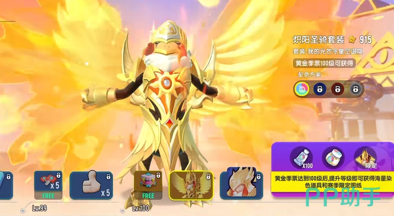 最后重量级的就是百级的炽阳圣骑套装,加上前面解锁的动作,可以刚好完美的组成,我们华丽的圣骑士系列。同时,也是本作游戏当中第一款可供玩家们自定义换色的皮肤。一个套装总共有四款不同的颜色,而且不同颜色呈现出来的效果也截然不同。我们只需要收集染色道具,加上赛季图纸就可以自定义染色了。