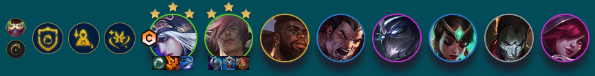 司令德玛卡莎:3个德玛西亚3个比尔吉沃特,阵容是卡莎、泰坦、剑姬、女枪、皇子、狗头、船长和奎因。主C是卡莎,给卡莎青龙刀、法爆和吸血枪。给泰坦肉,给剑姬泰坦的坚决和饮血剑,多余的给女枪装备。这套阵容基本没什么天克阵容,一般都能玩。