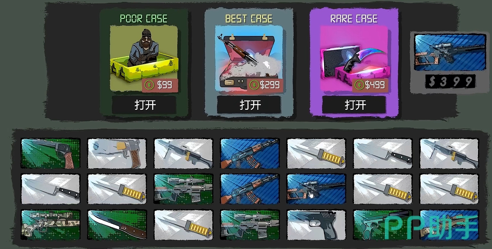 购买之后,他会给我们3x7,总共21个盲盒选项。我们可以随意挑选我们所想要的盲盒进行开启,其开出的物品价值从最低的普通小刀到高级的枪皮,价格不等。便宜的话,99的箱子只能买15的电钻,贵的话,直接99箱子开到399的大狙皮肤。净赚300块,而且成本又低,来钱又快。