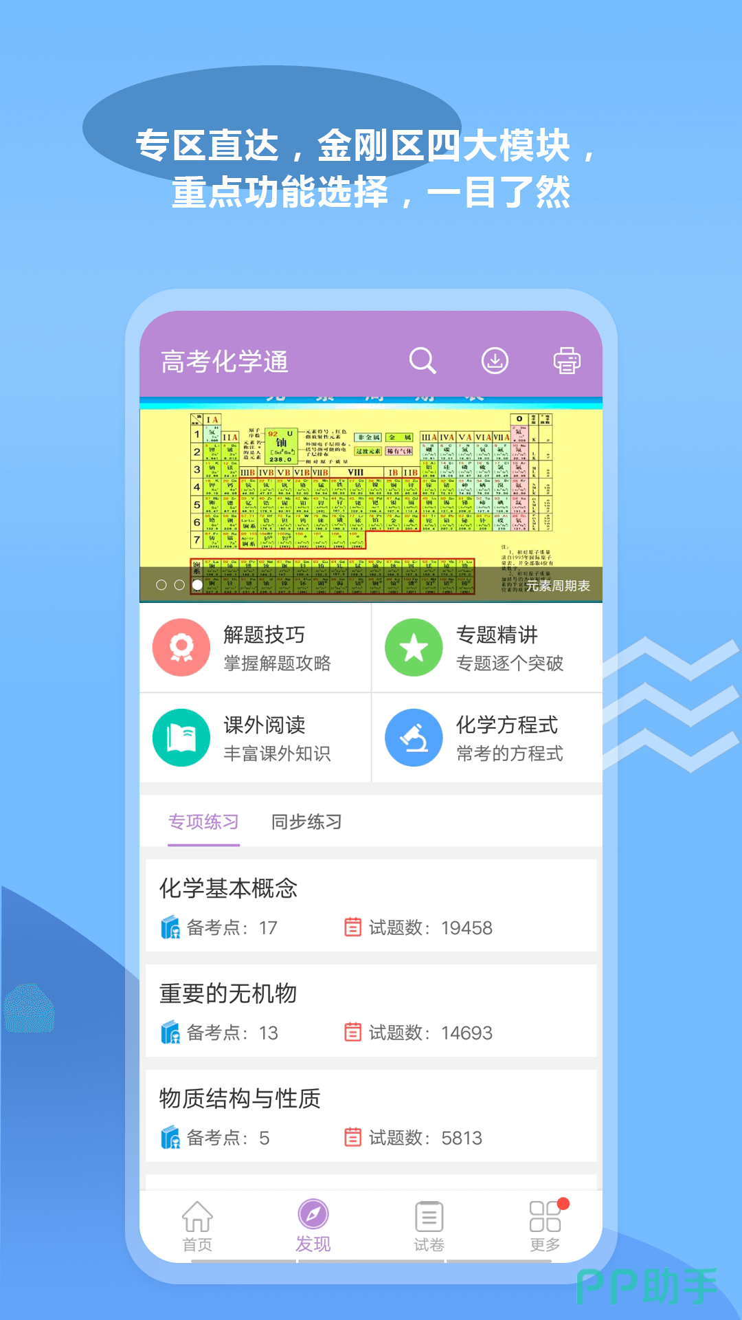 高考化学通这款软件是一款专门针对于高考化学分数提分的App软件,能够助力我们在最终的高考化学板块获得良好的成绩,各位用户们能够在这款软件上获取不同年份的化学真题考点众所周知,高考的题目具有复现性的特点,所以我们可以根据这些基础考点来入手学习我们的化学内容。同时在这款软件上大家能够将这些真题试卷下载或者是打印出来,方便我们进行作答。