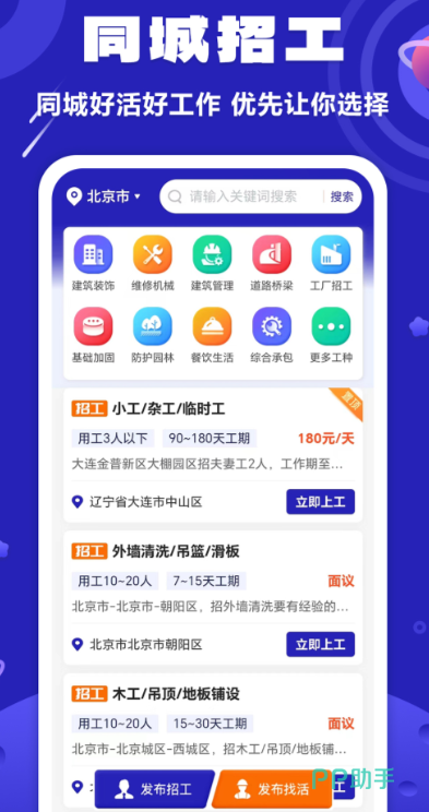 在此平台中经常找一些师傅、工人,让他们接单,师傅的联系方式都在平台中。而且无论是找工作的还是招聘人员都能很快速、很大范围的找到合适的人。而且平台中的同城招工,给附近的人很好的工作机会。