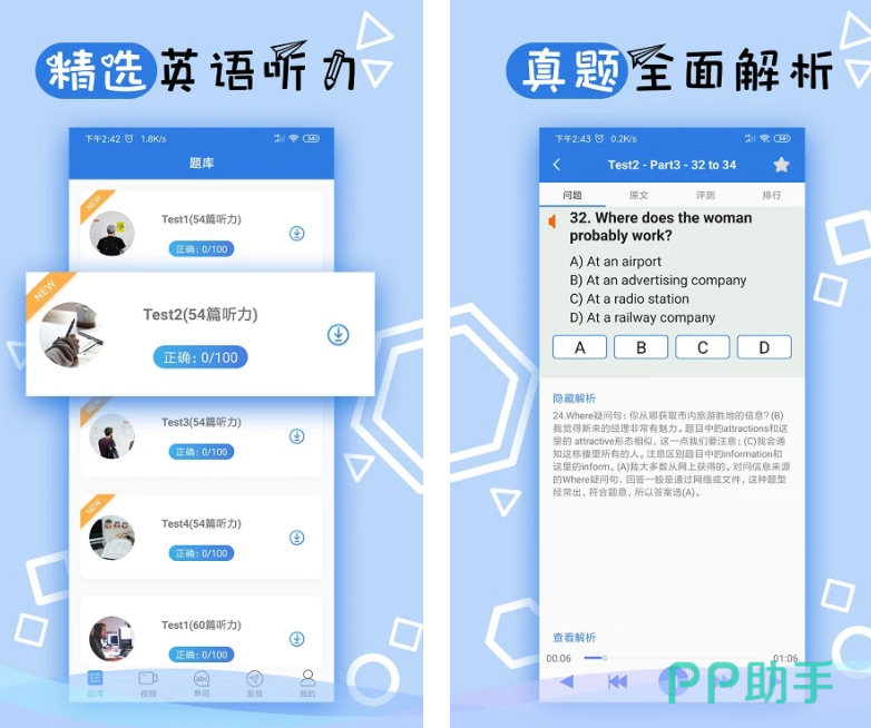 这款软件专注于雅思考试学习,不仅有历届的剑桥雅思真题,还有特色的口语题库、精听题库,帮你提升听力的分数。而且软件还有历届考试学生分享口语考场经验,想练雅思听力就快下载吧。