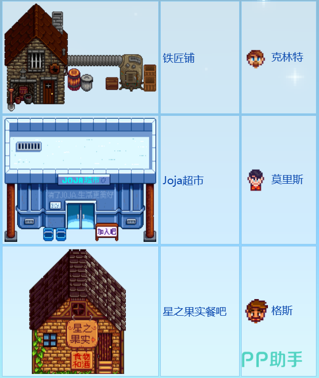 村中:这里有18个人物,分别是刘易斯(村长),马尼(护士),哈维(医生),皮埃尔(种子店老板),卡罗琳(皮埃尔的妻子),艾比盖尔(皮埃尔的女儿),乔治(轮椅老头),埃芙琳(乔治的妻子),阿莱克斯(乔治的孙子),贾斯(小男孩),文森特(小男孩),潘妮(贾斯和文森特的母亲),萨姆(音乐家),肯特(萨姆的父亲,退伍军人),乔迪(萨姆的母亲),海利(时尚女孩),艾米莉(海利的姐姐,裁缝),克劳斯(酒吧老板)。他们都住在村中的不同建筑里,你可以在这里找到他们的家,医院,种子店,酒吧等。你可以在这里给他们送礼物,接受他们的任务,参加他们的活动,了解他们的故事。