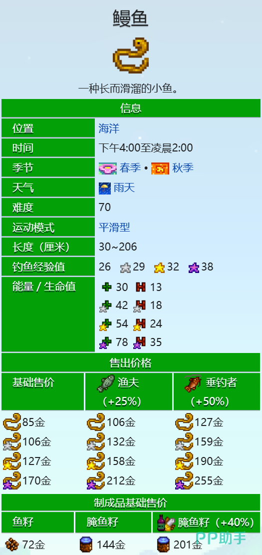 鳗鱼只有在春季和秋季的雨天才会出现,而且只能在海洋里钓到。具体的时间段是从下午4点到凌晨2点,也就是游戏内的夜晚。所以说如果想钓到鳗鱼需要注意天气预报,选择合适的季节和时间去海边垂钓。鳗鱼的难度为70,运动模式为平滑型,所以需要有一定的钓鱼技巧和耐心才能成功钓上来。