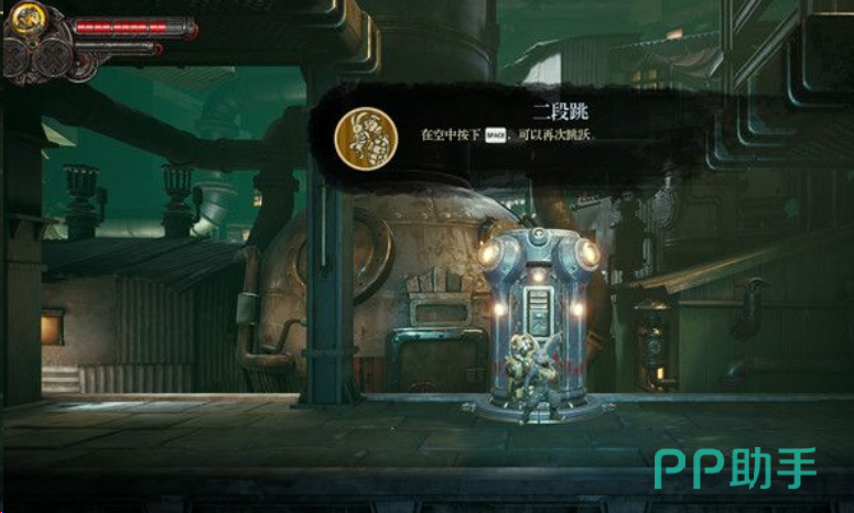 除了蹬墙跳,这个游戏还有另一个弹跳技能是二段跳。这项功能的又一个超级实用,它可以让你跳上本来够不着的高台,或者在战斗中进行空中的调整。操作起来确实有一定的节奏感,先跳一下,到达最高点后再跳第二下才是正确的操作方式,连续按两下是跳不高的,横向跳跃也是一样道理。这个能力是在前期主线就必须要获得的。