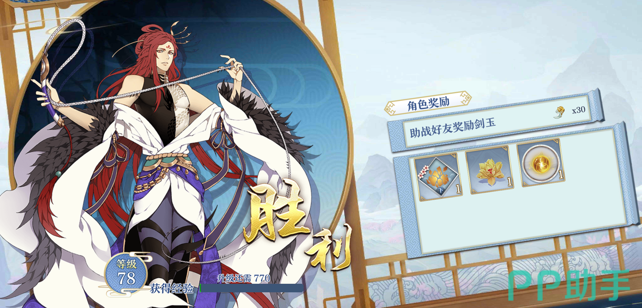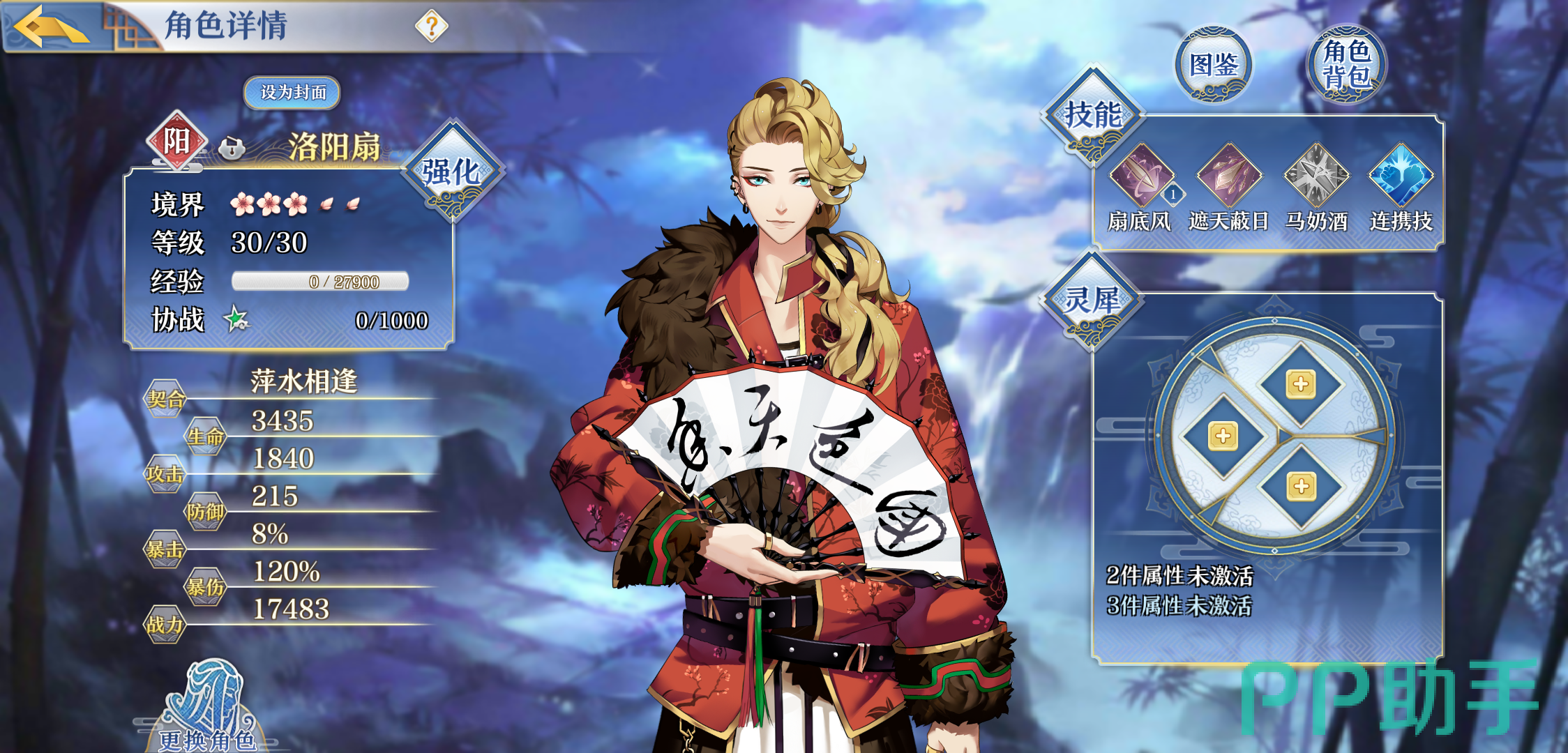 洛阳扇30级,3花,技能1,灵犀未使用。关卡等级较低可以不用在意灵犀的搭配。