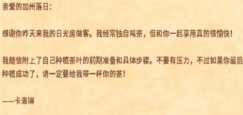 5、一段时间后,将会受到卡洛琳送来农场外的信件,信件上的内容就是茶苗种子配方和种植方法,读完后即可解锁种植茶苗。