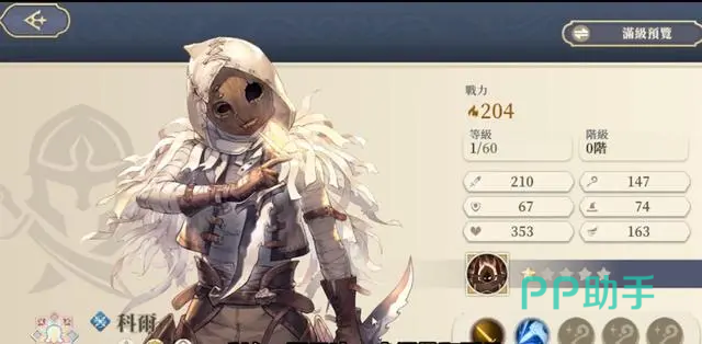 第二个推荐科尔,这个角色从立绘上虽然看不到她真实的面目,毕竟带着面具,然后身上缠满了绷带,看起来有点诡异的角色,但是想不到的是这竟然是一个软妹子。与外形比较匹配的反而是她的职业,她是一名优秀的刺客,拥有很强的暴击能力,同时移动能力非常优秀,而且她拥有一个很特别的能力,就是如果击杀了对手的话,那么将可以获得再次行动的能力,会出现一个回合行动三次的情况,可以说是十分强悍了,是脆皮角色的克星。