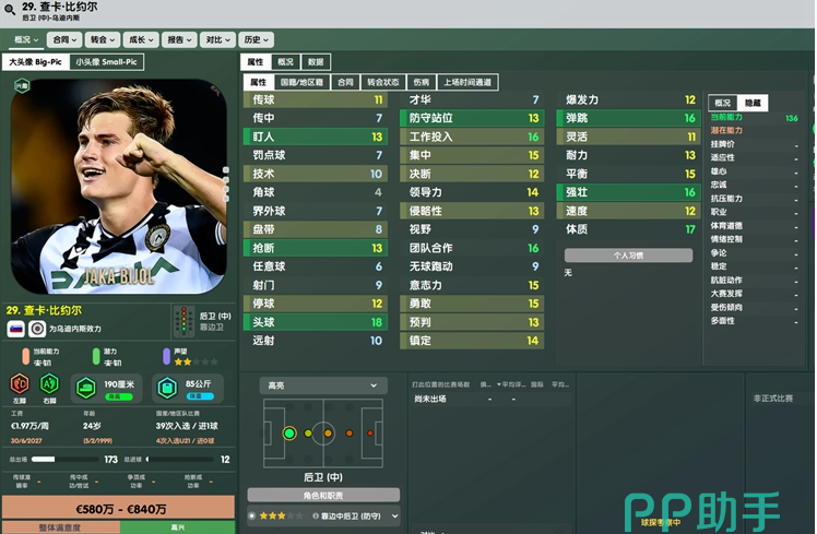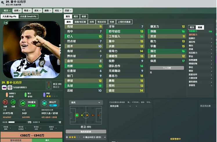 第一位推荐的中后卫叫做查卡比约尔,来自意甲,目前为乌迪内斯效力。这名球员身价仅需650W,对比他的能力可以说是非常便宜了。